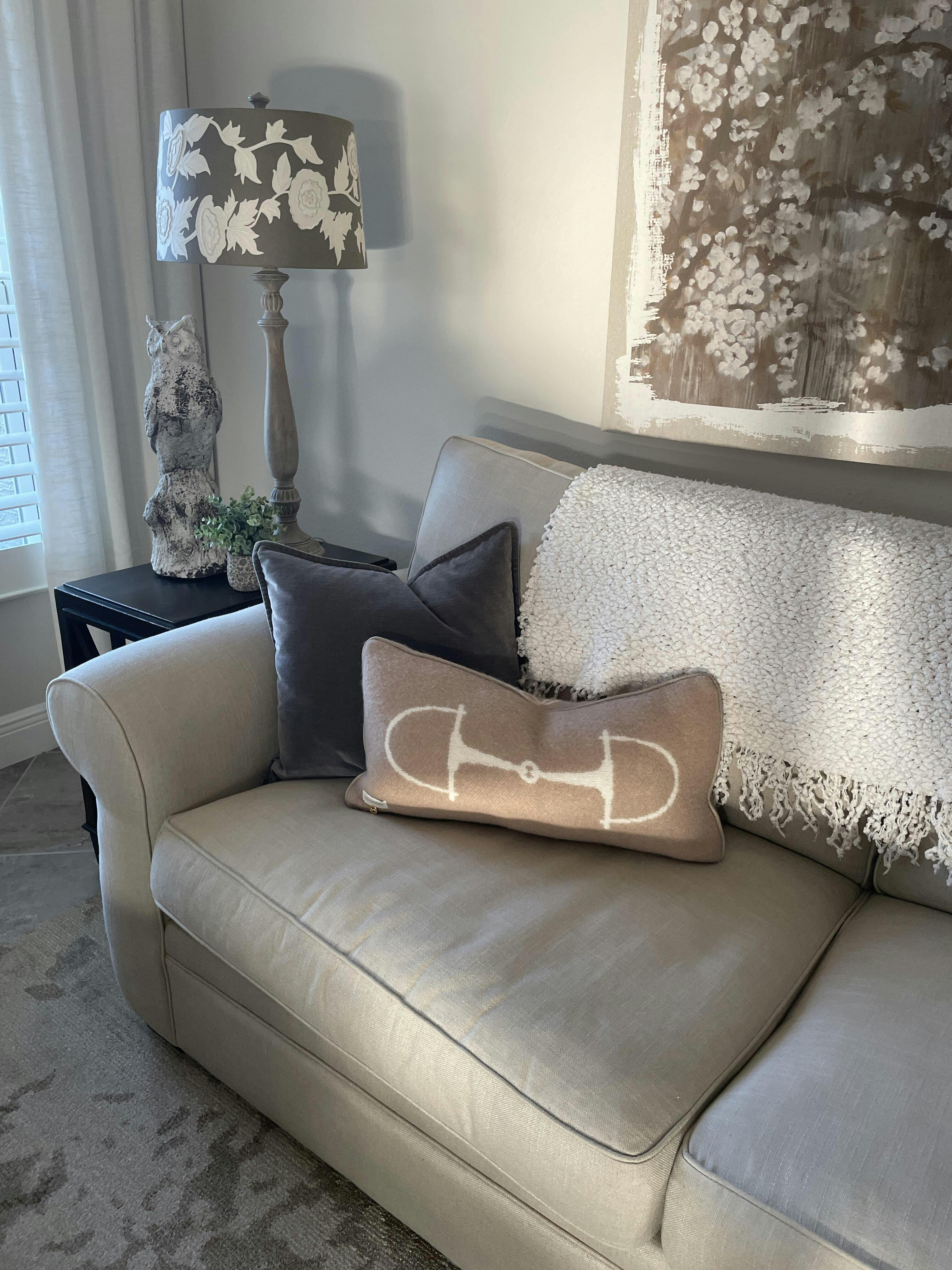 SpiceDazzle your home spaces with a "bit" of luxury and a lot of equestrian charm. Our Equine Lumbar Wool Pillow features a luxurious wool with classic horse bit design. Edges are finished with beautiful faux suede piping. Double-sided with a hidden zipper.